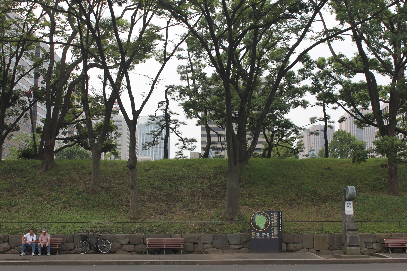 Here is a picture of two men on a bench on the grounds of the Tokyo Imperial Palace.