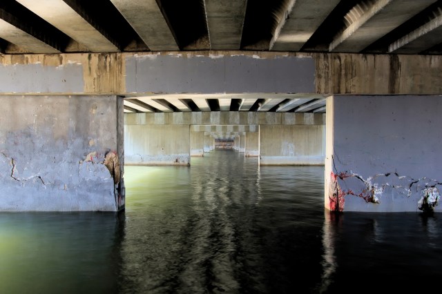 I like how the underside of the overpass is reflected in the water, showing a number of lines.