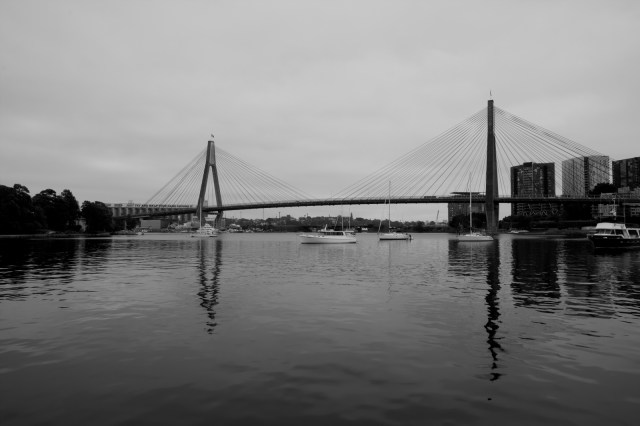 That’s a beautiful bridge, with a pretty skyline behind it. It looks great in black and white. The reflections are wonderful.