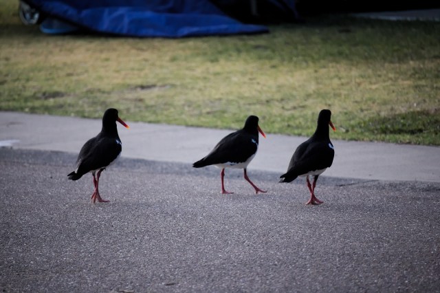 Three pied oystercatchers walking along as seen in a caravan park whilst on a field trip.
