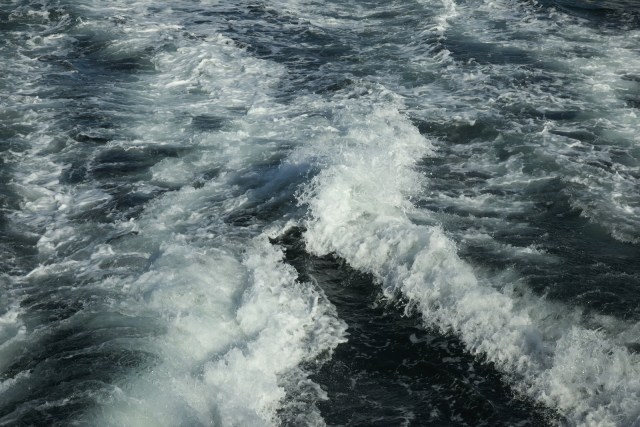 I like the way the (mostly) undisturbed water disappears between the wake, and I also like how the wake seems to be crashing over itself.