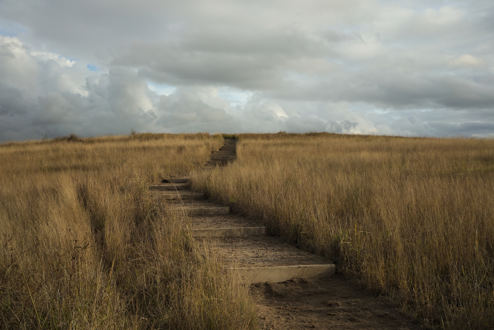 A stairway that takes one to the top of the hill as it cuts into the hill.