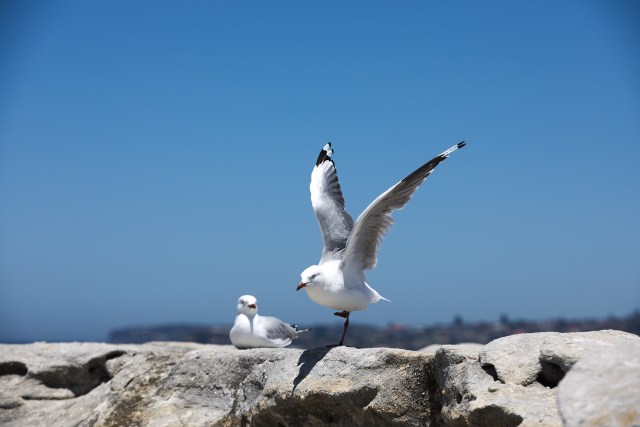 A silver gull shortly before it takes to the air in order to head to a location that is not the on in which it was residing.
