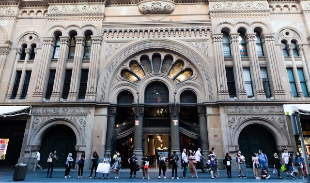 There was a large line of people waiting for a bus outside The Queen Victoria Building.