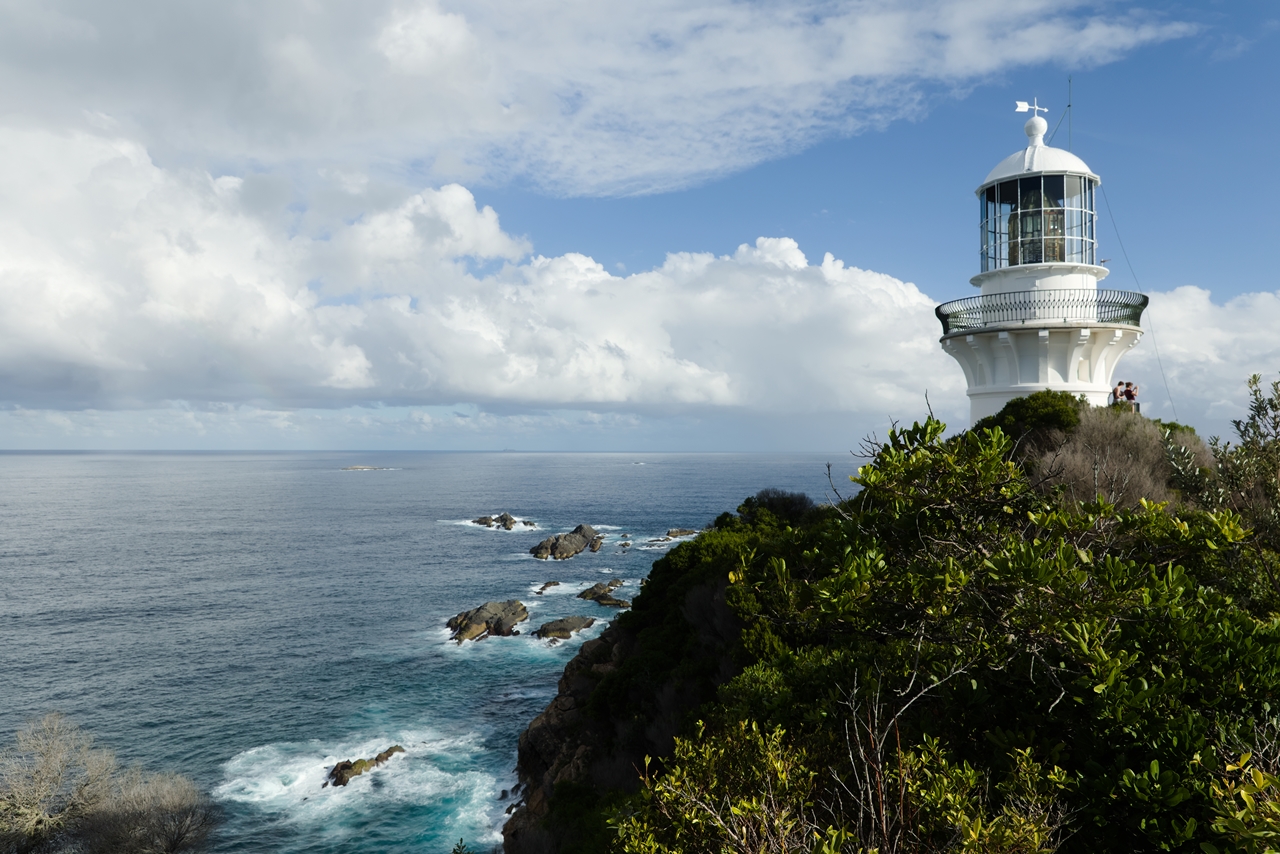 This was taken at Sugarloaf Point. The photo features a small part of Sugarloaf Point Lighthouse, as well as some vegetation, geology, ocean and cloud cover.