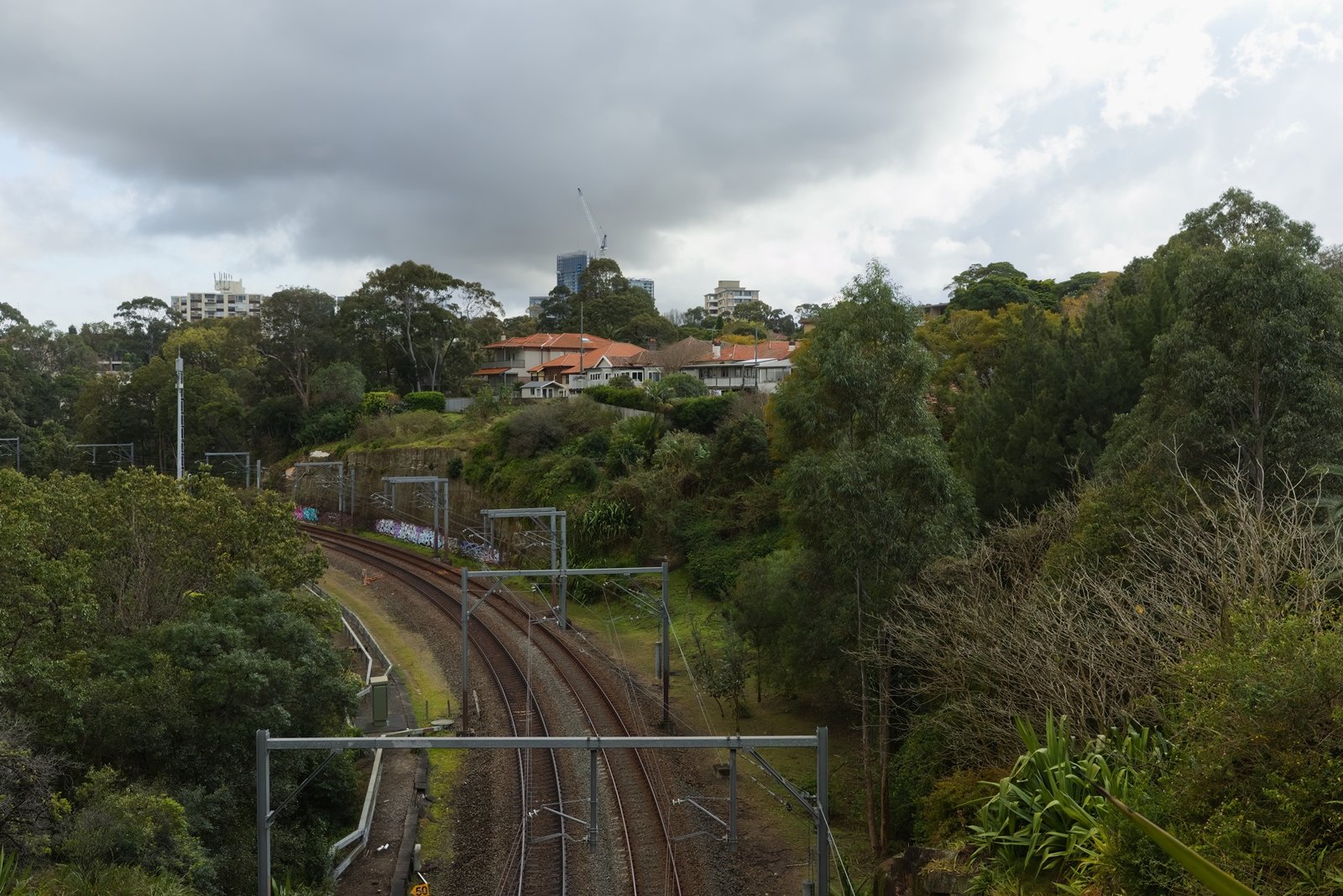 I like how the tracks curve and how, among the plants there are a few buildings peeping out. The tracks are clear but disappear behind the plants, and the buildings seem unable to get away from them either.
