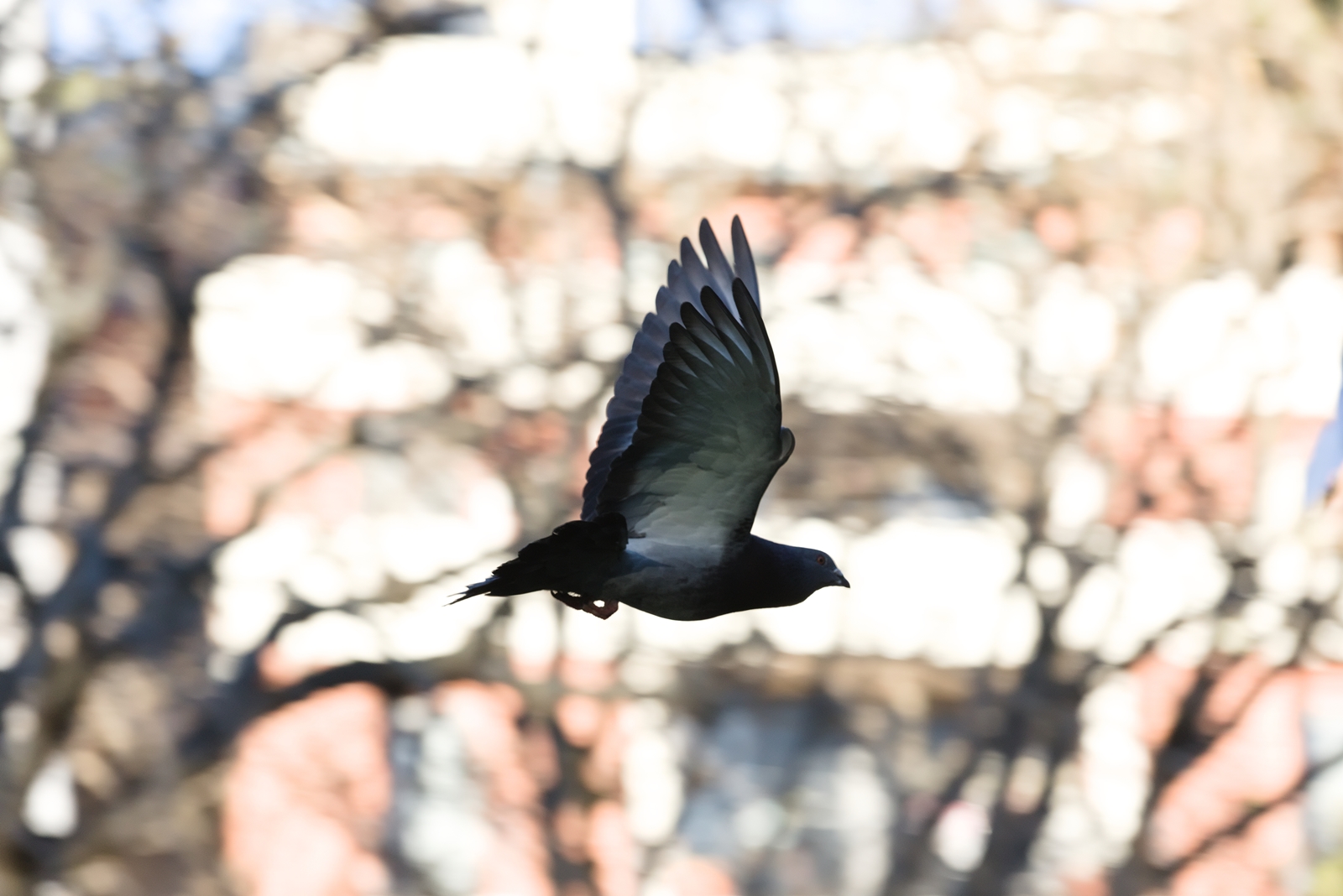 A photo of a Rock Dove flying from one location to another. It was likely over a short distance in which the rock dove was flying.