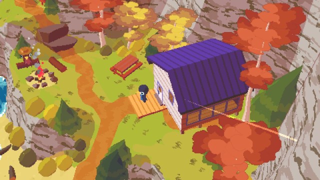 A Short Hike opens with a car driving during the evening. There’s a short conversation, then the scene shifts to a small house near a beach in Hawk Peak Provincial Park.