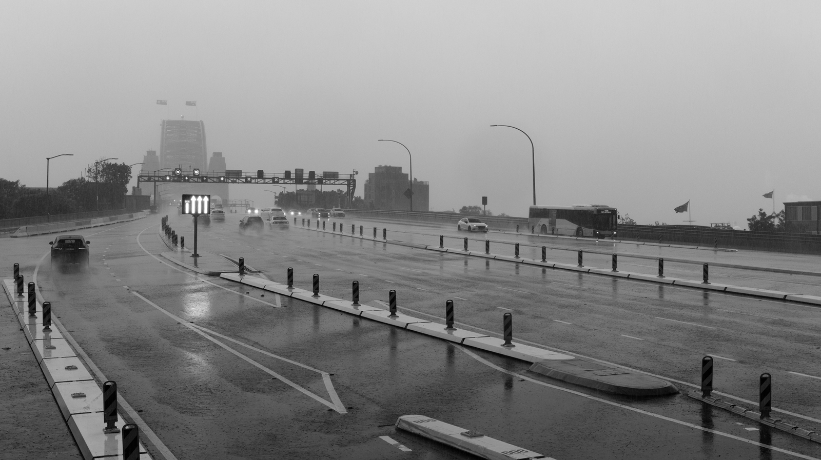 I like how the rain makes Sydney Harbour Bridge appear faded as it creates a stronger sense of distance.