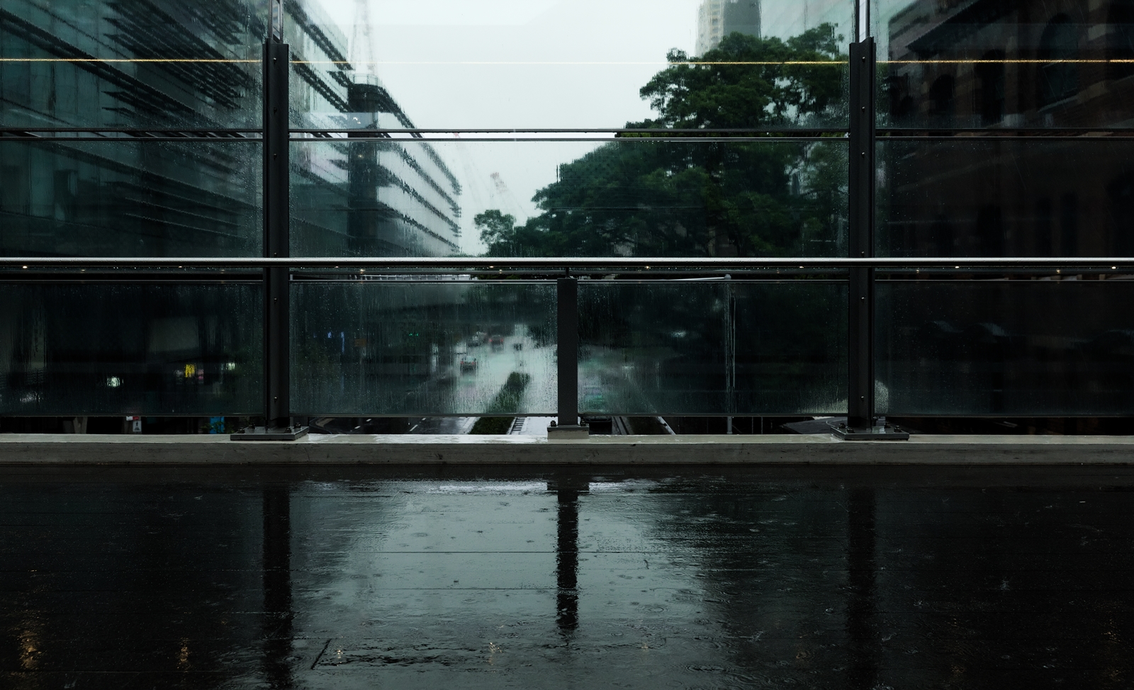 The view through the glass is a bit smeared, the reflection of the glass wall’s frame (as well as a few lights) becomes visible, and you can see some of the droplets hitting the walkway part of the bridge.