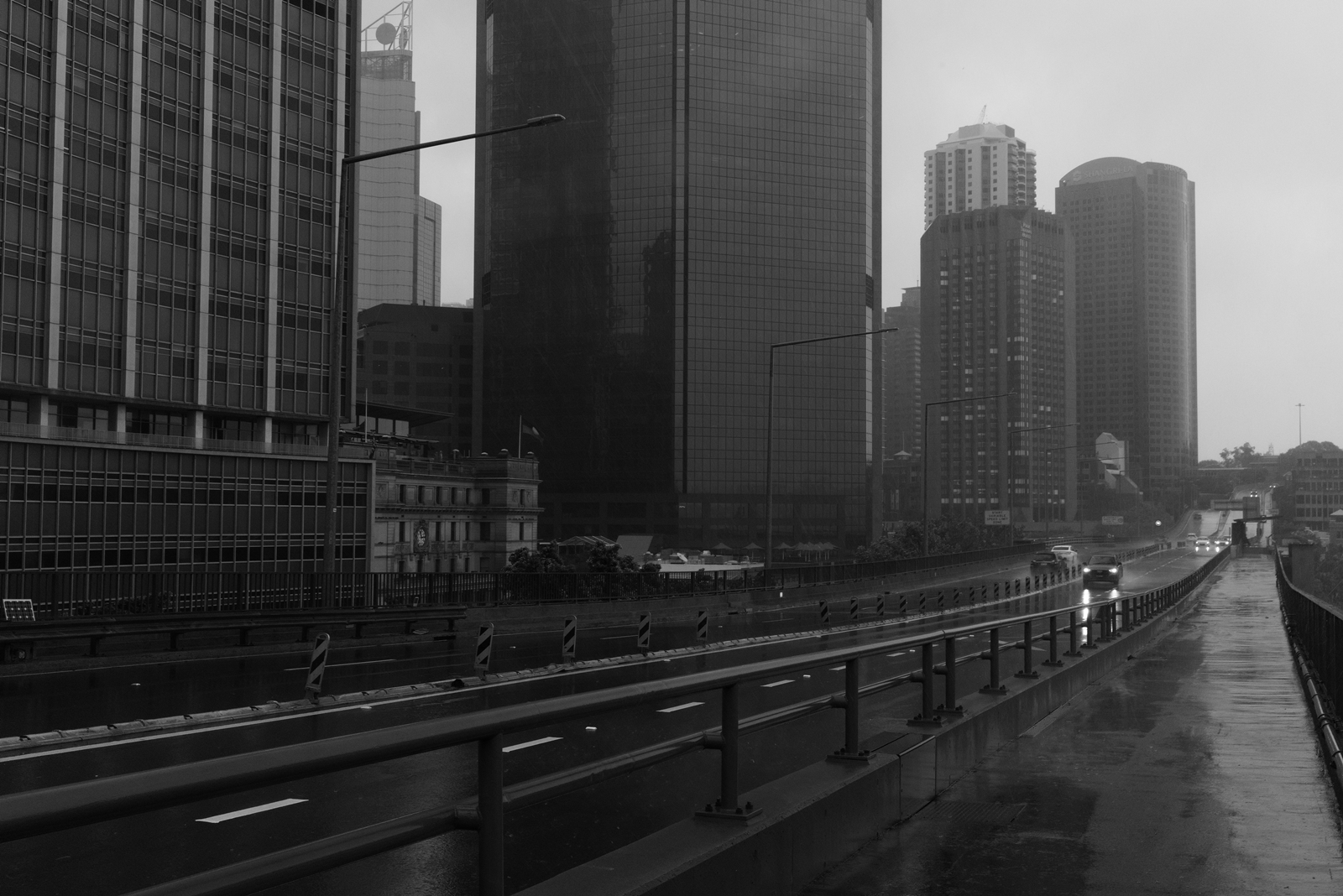 I like that this image feels a bit quiet. There are visible vehicles, but there’s quite a bit of space around them. I also like that (in conjunction with the rain) the buildings feel a bit oppressive.