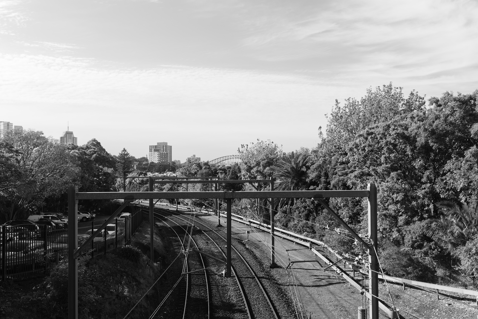 The train tracks are the most prominent thing due to requiring cleared space. The vegetation borders the tracks and add a bit of extra detail. The Sydney Harbour Bridge, few visible buildings and the cars contextualise the tracks as being in an urban location.