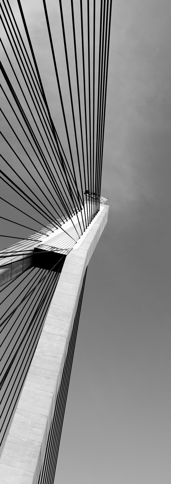 I think this photo implies a sense of elongation both in the arch and the suspension cables. I like that it does as it helps impose the sense of being under a towering structure.