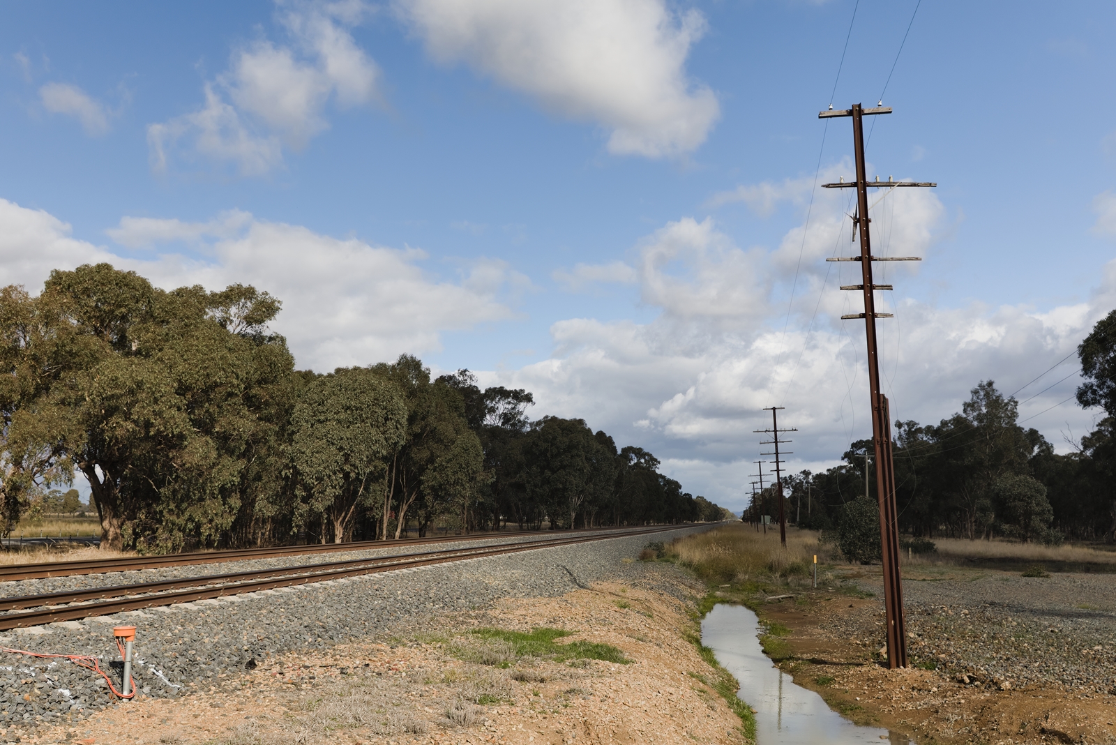 A bit dry. Rust, signifying age. Tracks leading somewhere and clouds that appear fine close up, but off in the distance, seem to indicate a bit of rain.