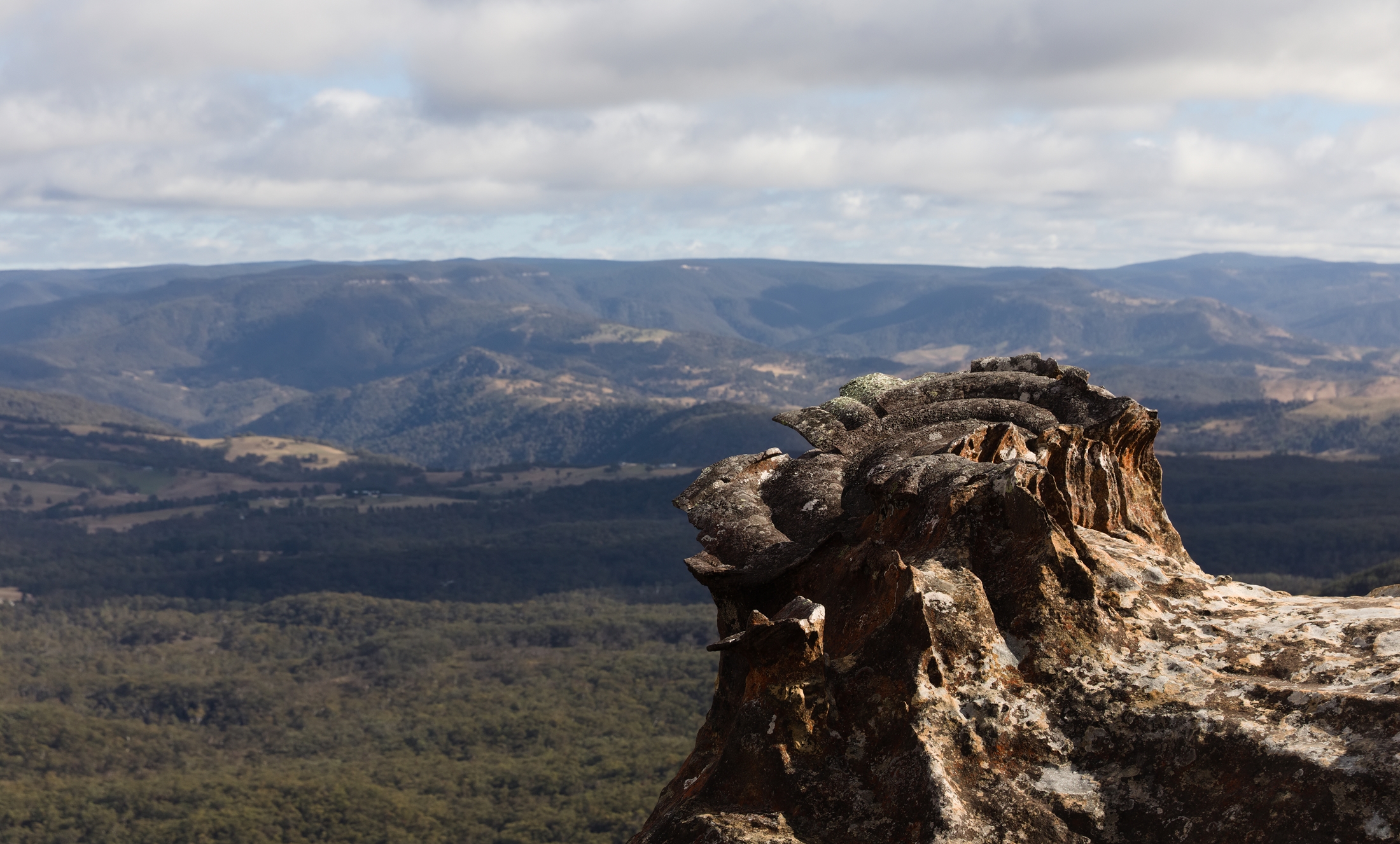 I like the pattern in the rock, as well as how it appears in contrast to the valley. The light on the rock is strong and helps to draw attention to it, whereas the light in the valley appears softer. It might have something to do with where the focus in the image lies too, but I think the contrasts work here.