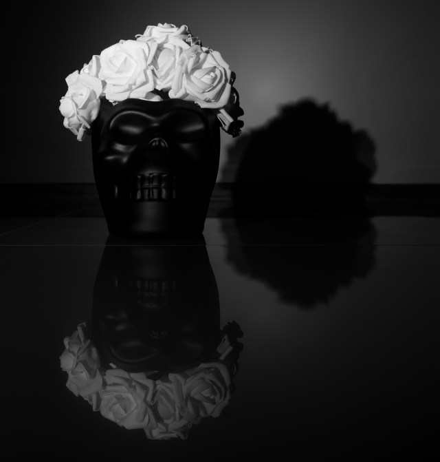 This was taken around the same time as yesterday’s photo. With this one I was trying to align so that it appeared larger and a little more behind the skull than it appears here. It didn’t quite work out, but I think in terms of light contrast the photo works. I also think the flowers mostly came out really well; They’ve a good deal of clarity.