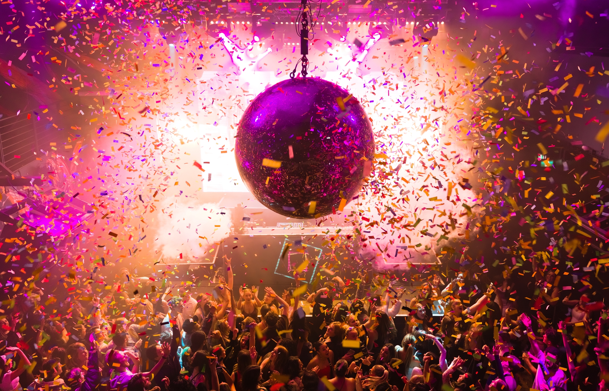The flash decided to start working again of its own accord and so I took a few photos from the balcony. After a minute, maybe a few minutes I heard something that made me think there was going to be some stage smoke shot out from the stage. I wanted a photo of stage smoke with the mirror ball as I thought it’d make a good photo and this was brought on by being in the crowd a bit earlier when the first bit of stage smoke was shot out from the stage.