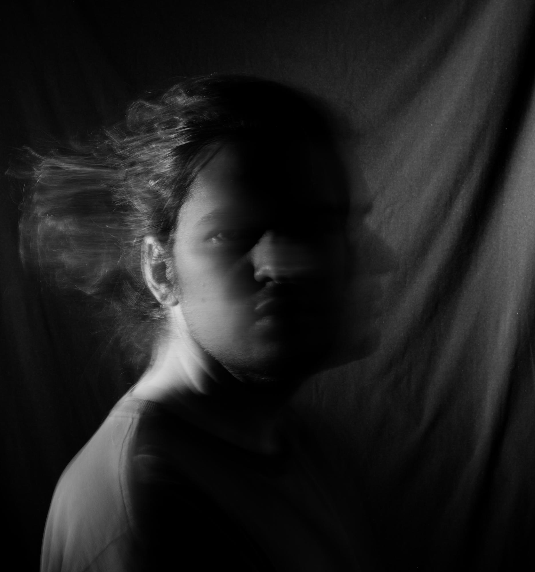 With this photo I was trying to create a smooth blur through turning my face. It didn’t work out as I’d hoped; instead I ended up with something where I wasn’t still enough in my body and not slow enough in my head and neck. I think the effect is interesting, however.