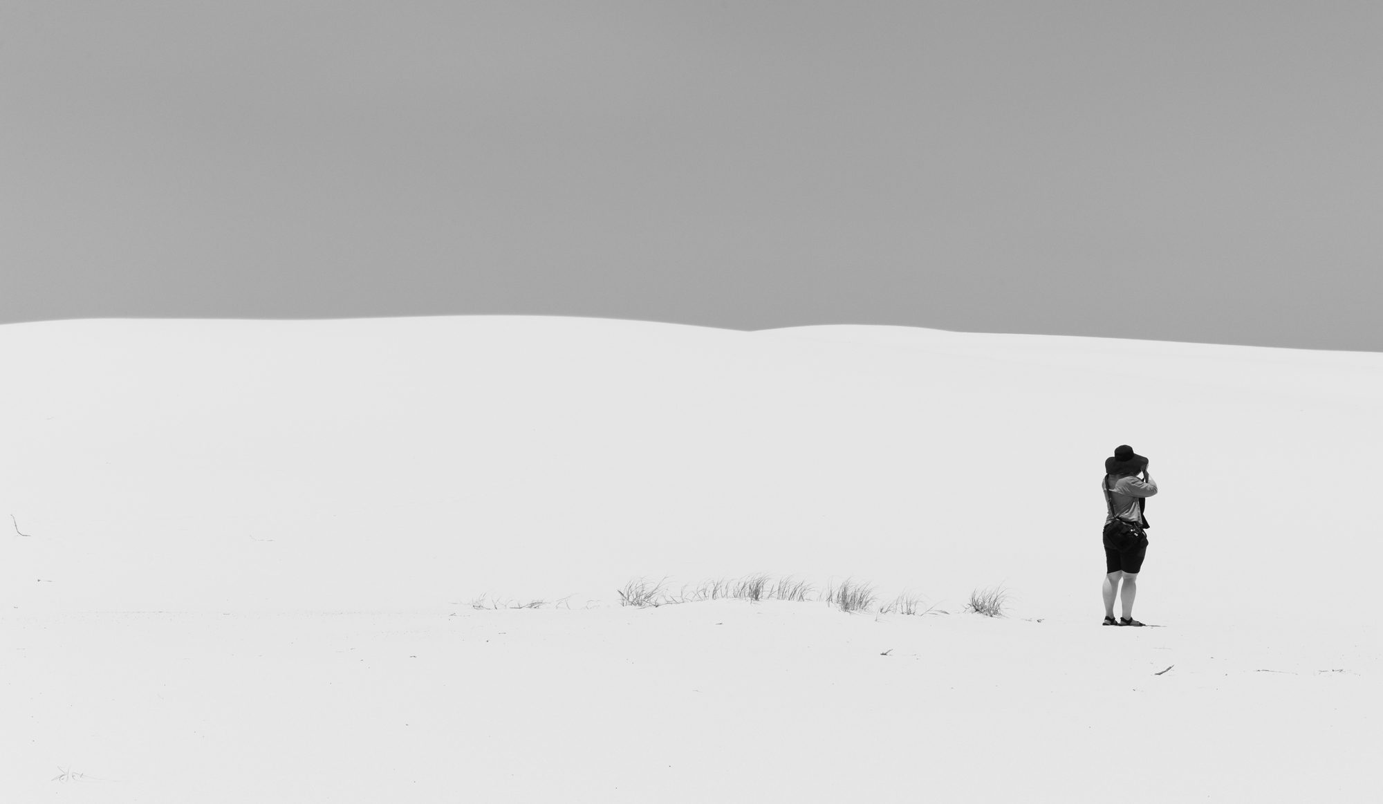 Minimalism is a great thing to engage in, I think. You can do great things with it, such as flattening spaces, which is kind of what’s happening here. There’s a line along where the person is standing, suggested by their placement and the placement of the vegetation, but beyond that, it’s almost as though the dune is a flat, featureless space.