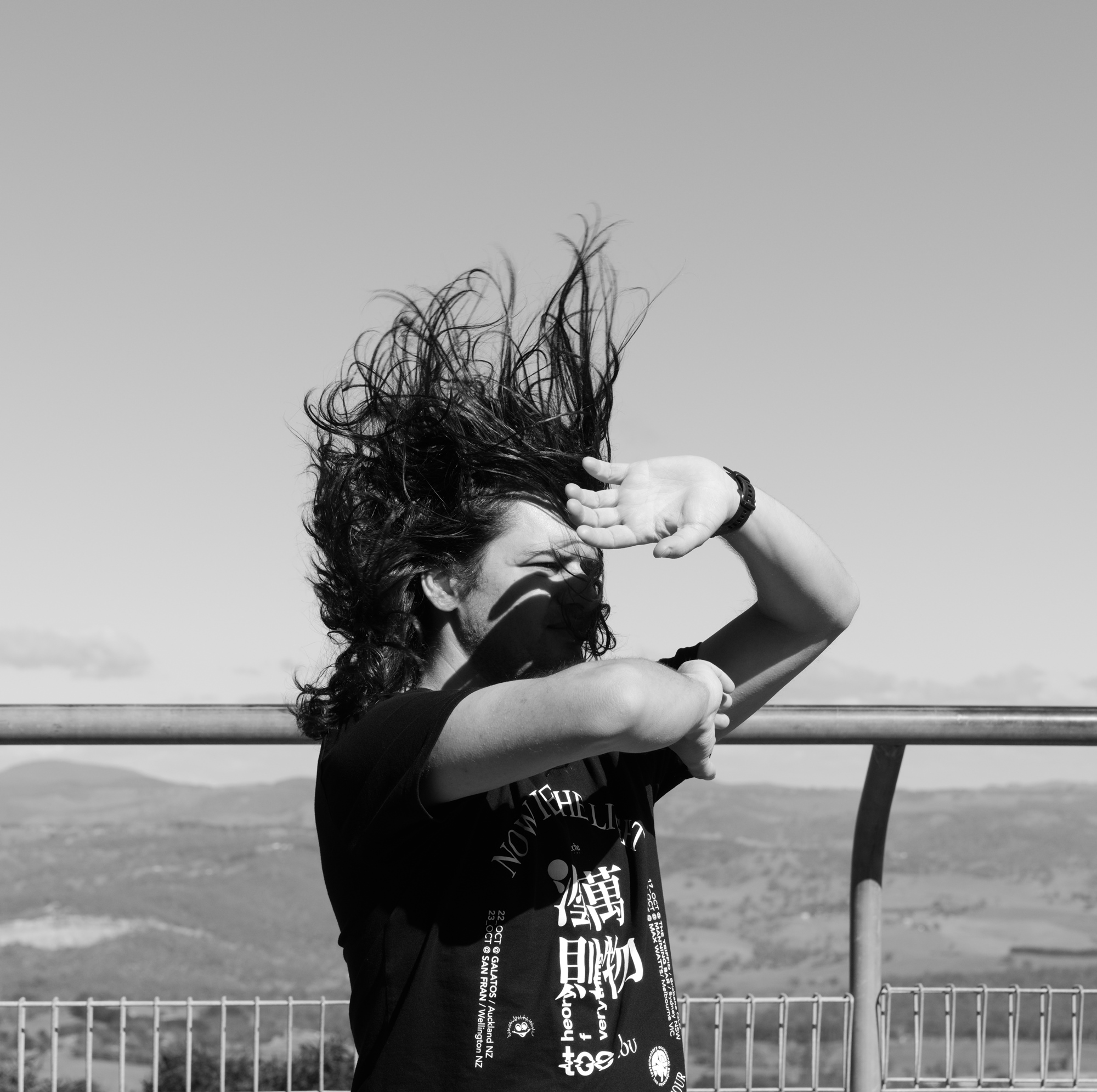 One great thing about the wind is how it can be used, such as in this photo, where I believe I was a bit more intentional in my posing. To me this feels like trying to block out a sudden harsh light. Not the best way to go about doing it.